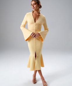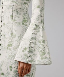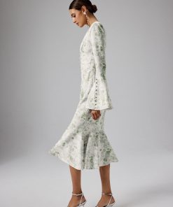 Lavish Alice Women’s Salma Fluted Sleeve Longline Fishtail Midi Dress In Sage Porcelain Print
