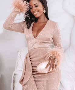 The APHRODITE Draped Skirt Pleated Sequin Mini Dress in Rose Gold is the perfect piece for a night out. This luxury dress-up occasion style features a feather trimmed sleeve and is sure to make you the showstopper at any event. Achieve a glamorous, confident, and stylish look with Aphrodite!