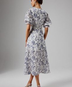 Looking for the perfect spring dress? Look no further than our CINDY dress, the perfect blend of feminine elegance and spring charm. Expertly crafted , this dress features a flattering midi length and a deep V neckline adorned with delicate loop trim and self-fabric covered buttons. The short puff sleeves add a touch of romance, while the flattering waistband with loop trim accentuates your figure beautifully. Complete with self-fabric buttons down the front centre of the skirt, this dress exudes timeless sophistication. Perfect for weddings, a day at the races, garden parties, or any formal springs RSVPs, this dress is a must-have for your spring and summer wardrobe.