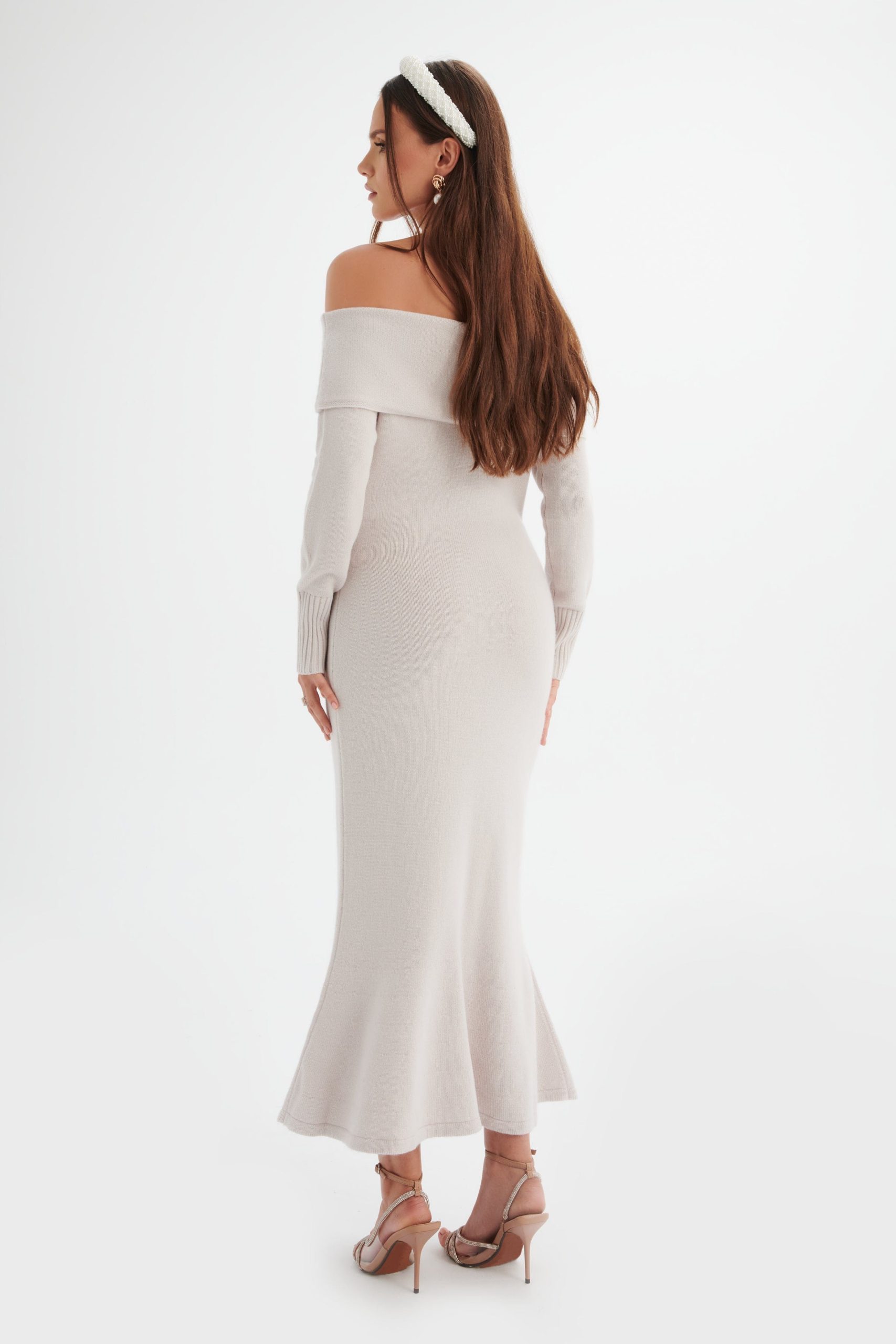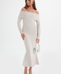Lavish Alice Women’s Clover Knitted Wool Bardot Midi Dress In Stone