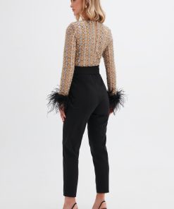 Elevate your evening wardrobe with our DELIA Embellished Feather Cuff Jumpsuit in Black. This exquisite piece blends glamour and sophistication with its stunning mix of sequin embellishments and embroidered sheer fabric on the upper body, paired seamlessly with high-quality tailored crepe trousers. Designed for elegance, the luxurious ostrich feather cuffs add a touch of opulence, while the self-fabric obi belt cinches the waist for a flattering fit. Timeless and versatile, the DELIA jumpsuit in classic black is perfect for any formal occasion or special event.