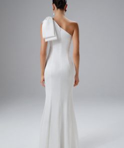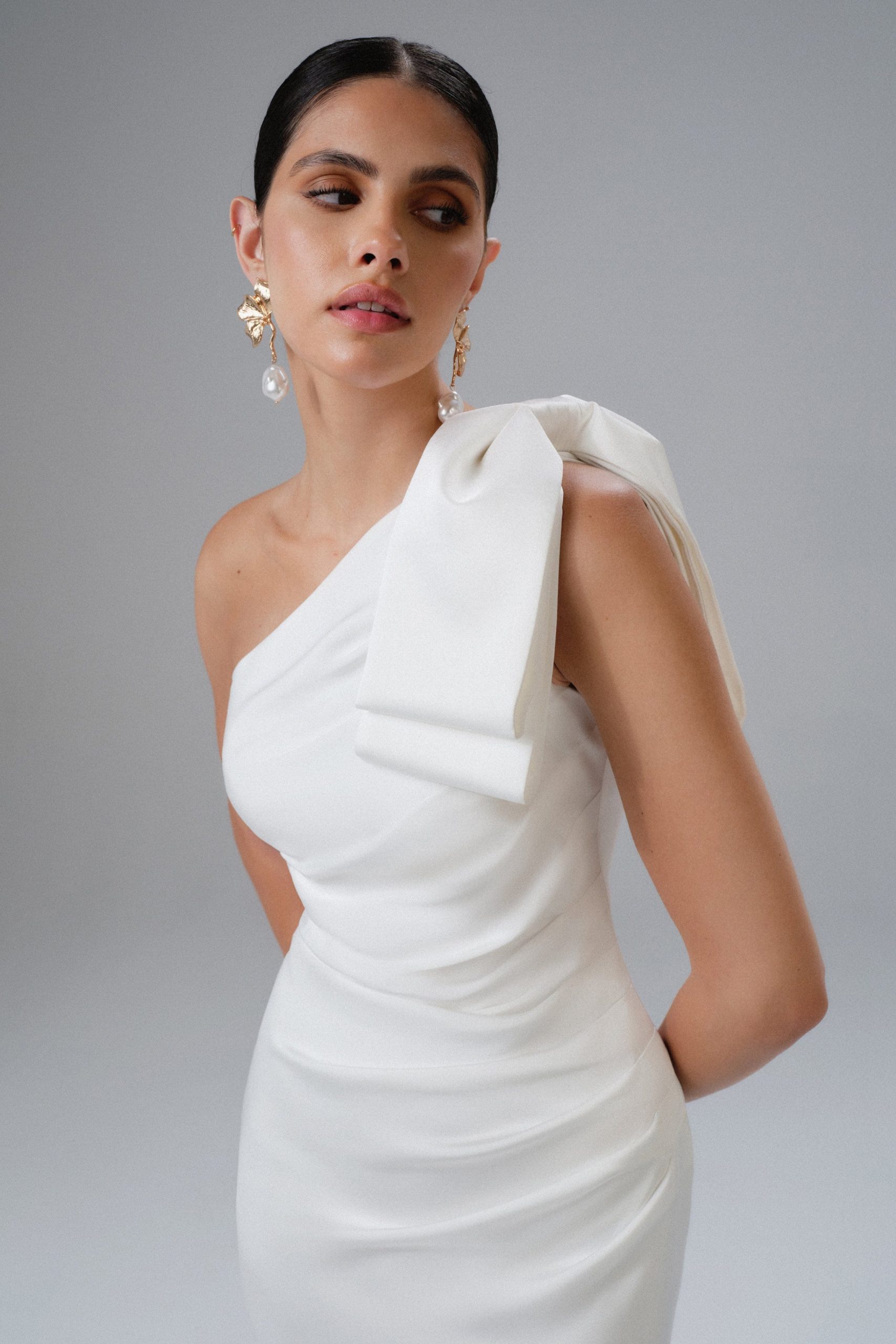 Sculptural elegance meets modern romance in the EMELIA maxi dress. Crafted from our luxurious white satin, this floor-length gown is designed to captivate with its sleek silhouette and statement details.The one-shoulder neckline is elevated by a bold, structured bow—expertly crafted from double-layer bonded satin for a flawless, sculpted finish. Soft pleating enhances the bodice and waistline, creating a figure-skimming shape that flatters from every angle.Minimal yet impactful, EMELIA is the perfect choice for bridal moments, elevated events, or any occasion that calls for refined drama.