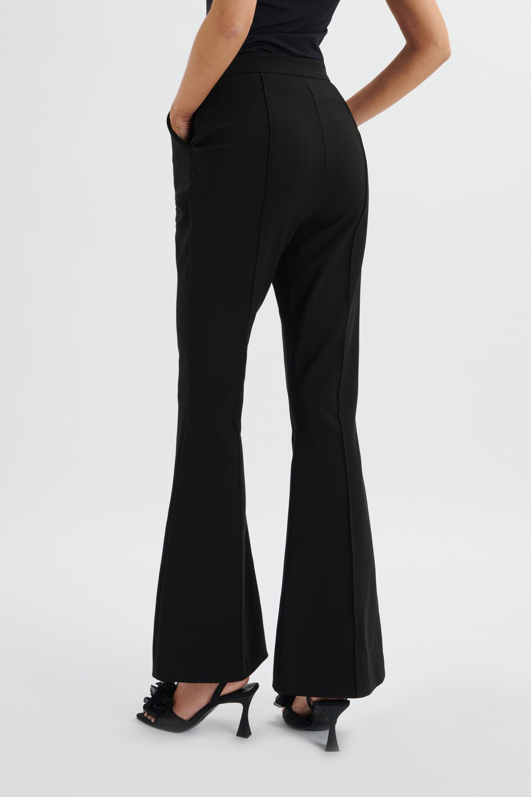 Expertly tailored for a flattering fit, the EMELIE fit & flare trouser is crafted from premium crepe fabric in sleek black. The centre leg pin tuck detail elongates the silhouette, whilst the side pockets add functionality. A sleek centre front zip with hook and bar fastening ensure easy wear.