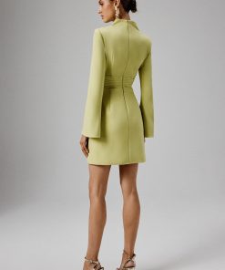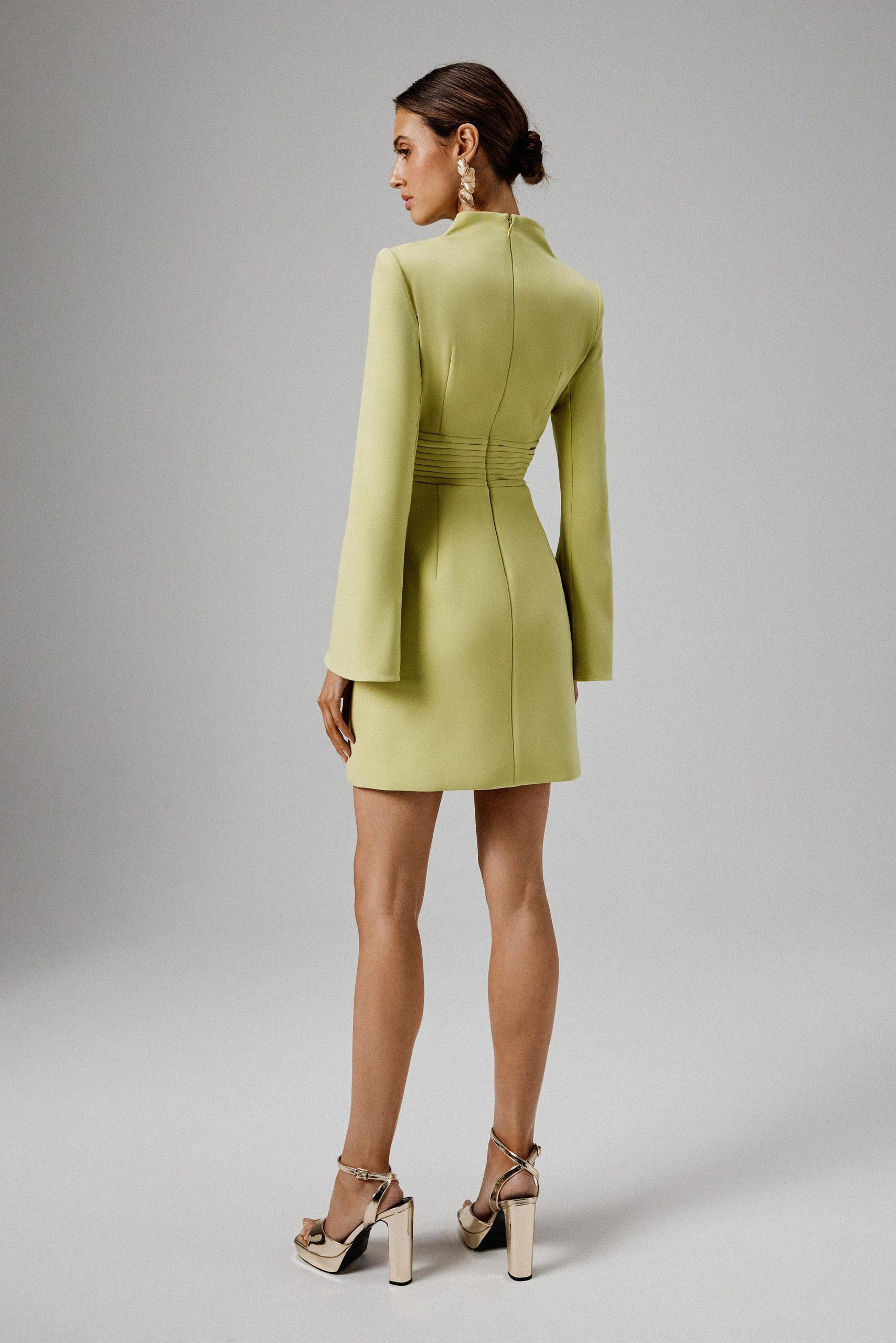 Elevate your spring wardrobe with our GEMMA High Neck Rose Button Mini Dress. Crafted from premium crepe in the season’s must-have lime green, this dress boasts an elegant high neck with pleat detail and long flared sleeves with a stylish split. The flattering pleated waistband and gold rose buttons add the perfect touch of sophistication. Ideal for weddings, ladies day, or a special date night, this dress is a chic and flattering choice that will make you stand out in any occasion.