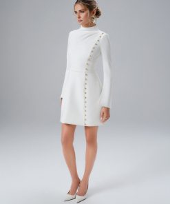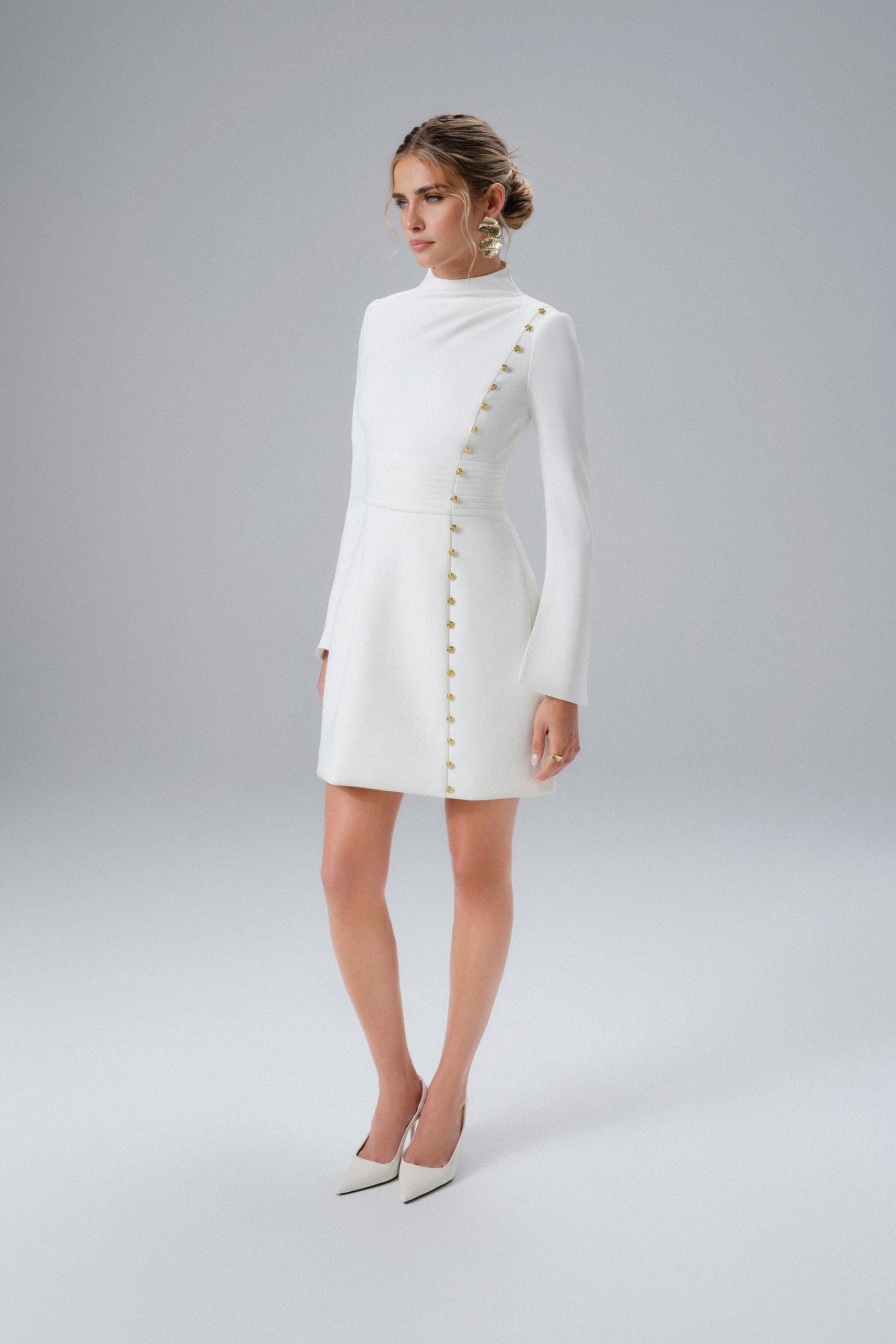Lavish Alice Women’s Gemma High Neck Rose Button Long Sleeve Mini Dress In White