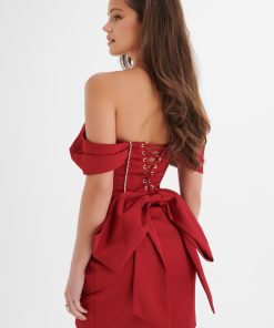 Experience luxury in our GEORGIE Satin Off Shoulder Lace Up Mini Dress, expertly crafted from premium satin in a stunning burgundy hue. This chic mini dress features a wrap skirt with deep pleating and an off-shoulder design for a graceful silhouette. The beautifully corseted waist, adorned with intricate embellishments, enhances the luxurious and glamorous feel, while the lace-up back and statement fixed bow add a romantic and alluring touch. Perfect for special occasions, parties, and elegant dinners, this dress exudes autumnal elegance.