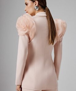Our IVY Organza Rose Sleeve Blazer in Light Pink is the perfect addition to your formal wardrobe. Crafted from premium crepe, its classic silhouette and lapel design exude timeless elegance. The statement organza rose on the shoulder sleeves adds a touch of romantic charm, while the functional self fabric covered buttons and jet pocket with flap offer practicality. Be ready to make a statement in this sleek and sophisticated blazer.