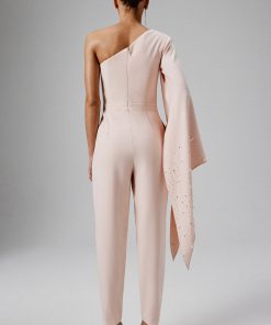 Elevate your style with the KADY Ombre Embellished One-Shoulder Jumpsuit in Pink, a perfect blend of elegance and modern flair. This luxurious jumpsuit is crafted from premium crepe fabric, featuring a chic one-shoulder neckline paired with a glamorous long cape sleeve. The sleeve is adorned with shimmering diamante and pearl embellishments, beautifully cascading in a mesmerizing ombre effect. The tailored fit of the tapered trousers enhances your silhouette, creating a sleek, polished look. Perfect for special occasions, evening events, or any formal gathering, this jumpsuit promises to deliver a head-turning look that exudes sophistication and charm.