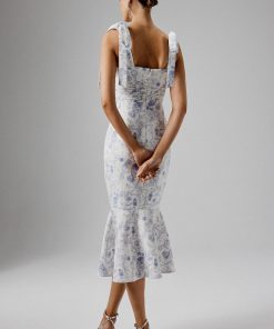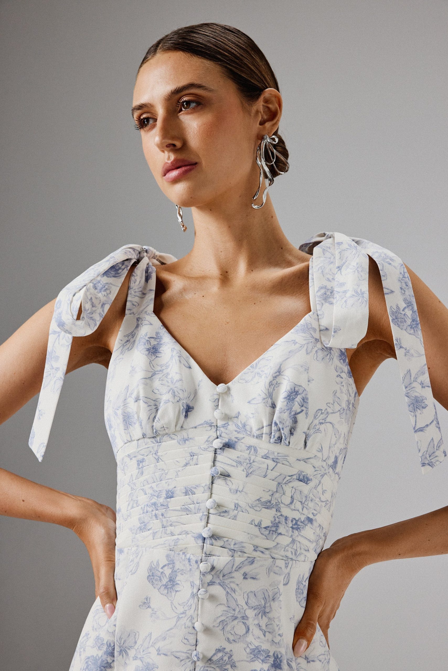 Lavish Alice Women’s Kamila Tie Strap Micro Button Crepe Midi Dress In Blue Porcelain Print