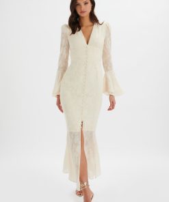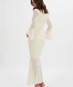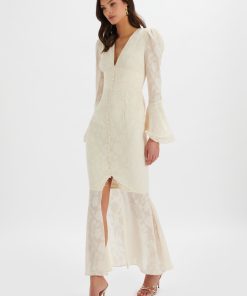 Experience effortless elegance in our LAUREN Fluted Sleeve Maxi Dress. Made from premium floral textured chiffon in a cream hue, this dress features fluted sleeves and a fishtail hem for an elongated contour, while the micro button detailing down the centre front adds a touch of sophistication. This dress is perfect for any spring or summer event, especially when paired with a tan.