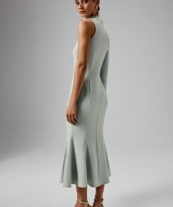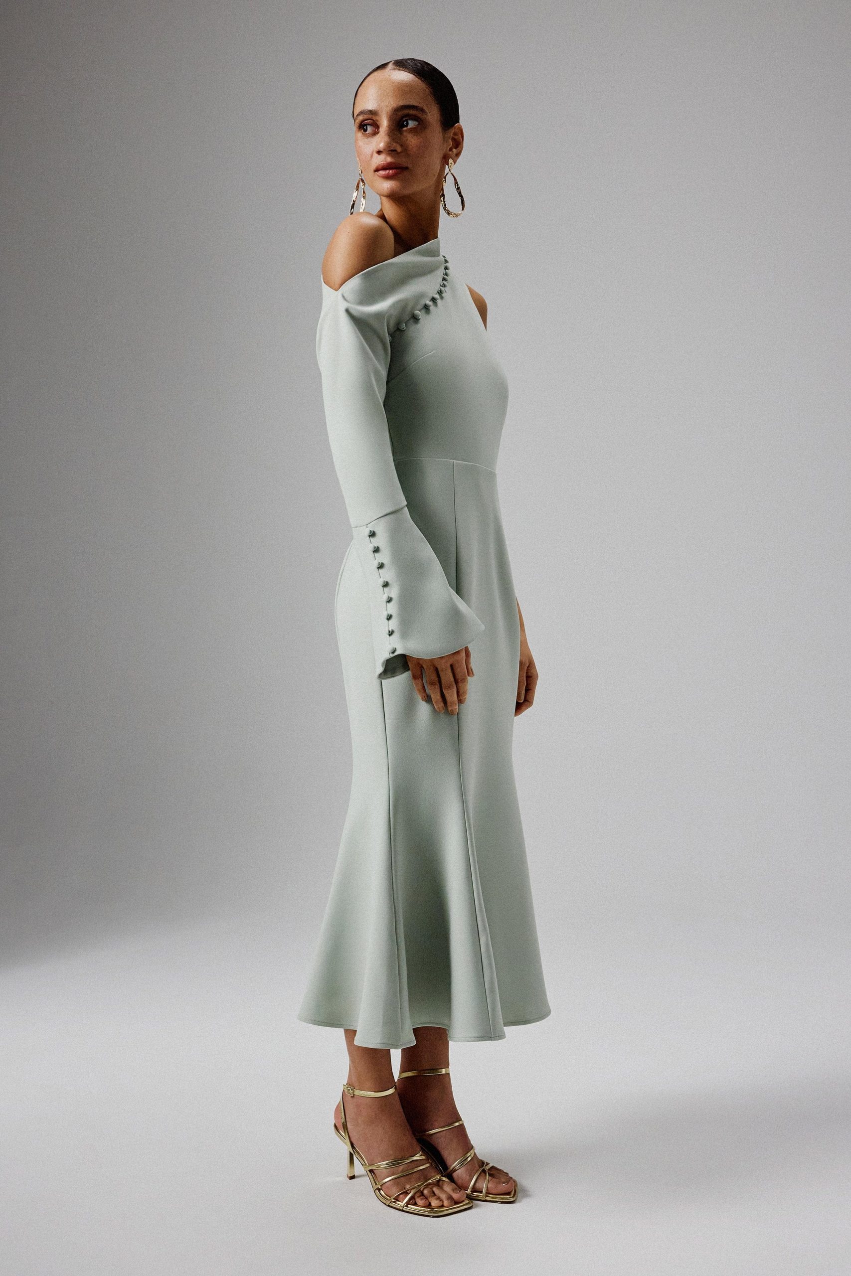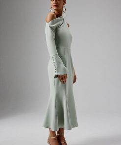 Discover elegance in our Asymmetric Split Shoulder Midi Dress in luxurious sage green crepe. This stunning piece combines a timeless fit and flare silhouette with a contemporary, one shoulder long sleeve with a striking split detail, creating an elegant yet modern statement. The dress is detailed with self-fabric buttons and a subtle fluted cuff, adding a touch of refined sophistication. Perfect for weddings, formal occasions or special date nights, it pairs beautifully with a soft updo for an effortlessly chic look.