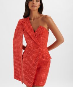 Dress to impress in the MARCY Crystal Embellished One Shoulder Cape Blazer Dress in red! Meticulously crafted from premium crepe in a captivating red hue, this mini dress showcases sparkling crystal embellishments and a unique asymmetric one-shoulder cape, infusing every moment with opulence and allure. Perfect for parties and special occasions.