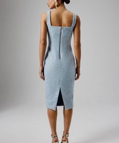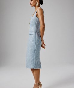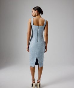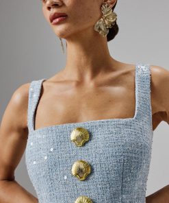Channel sophisticated elegance in our Square Neck Boucle Midi Dress with Shell Embellishment in Blue. Tailored to perfection, this bodycon silhouette is crafted from luxurious premium boucle fabric, showcasing a chic square neckline adorned with opulent gold braided trim. Striking gold shell embellishments grace the centre front, while jet pockets with gold braided trim flaps add an extra touch of sophistication. Perfect for formal occasions, sophisticated soirées, spring weddings, or Ladies’ Day, this dress is your ultimate choice for making a memorable impression.