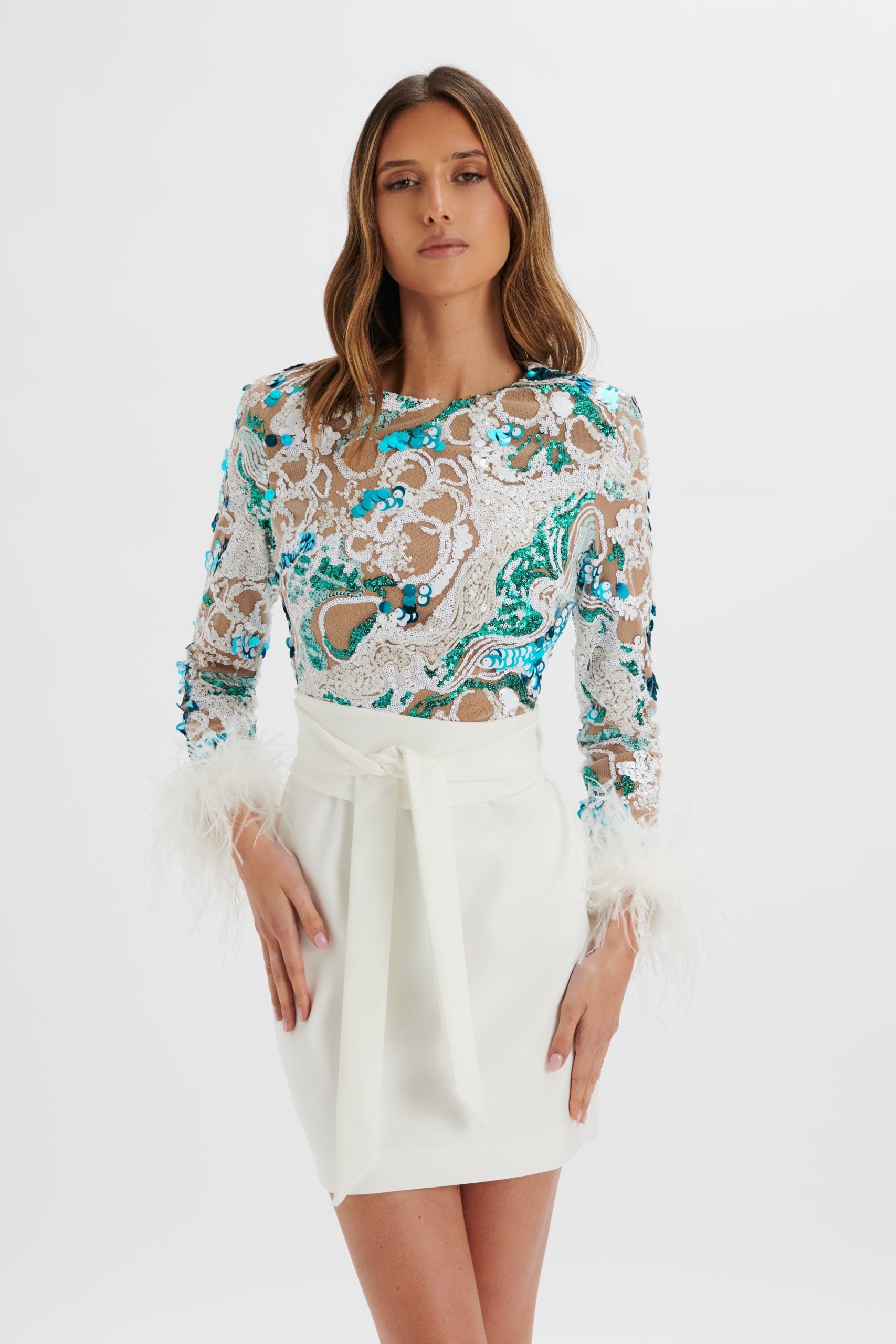 Elevate your style with the MEDINA Embellished Feather Cuff Mini Dress in White. This luxurious and glamorous dress features a mixed sequin embellished and embroidered sheer upper body, adorned with light-catching sequins and intricate detailing. The white skirt and long sleeves give a chic and elegant look, while the delicate ostrich feather cuff adds a touch of flair. Complete with a self-fabric obi belt to cinch the waist, this flattering mini dress is sure to make a statement at any event.