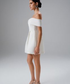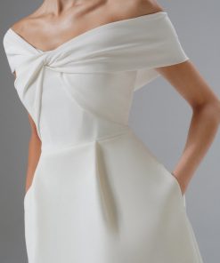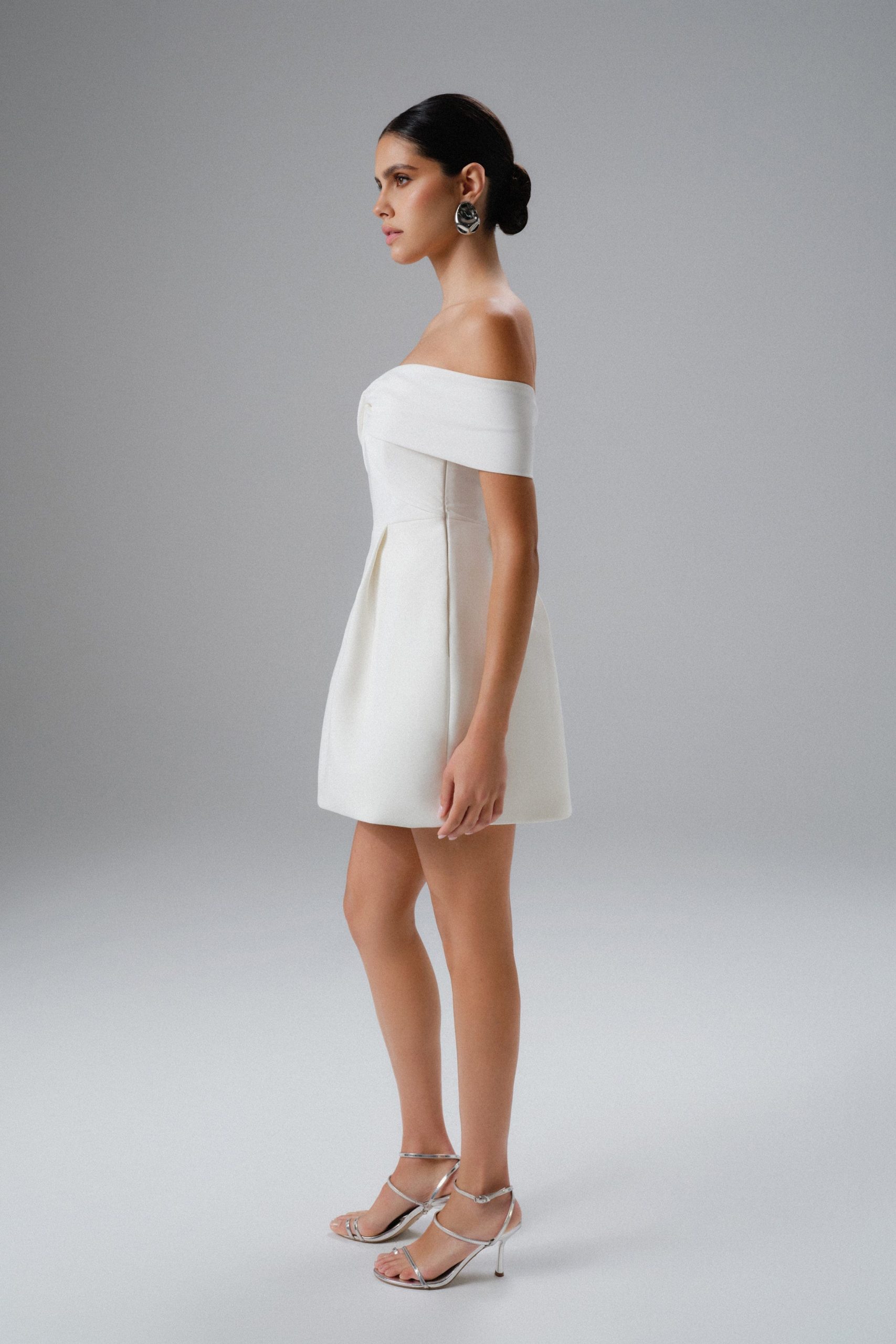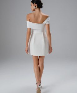 A signature silhouette, reimagined in timeless white. Our MILA dress is crafted from luxurious premium crepe and features an artfully twisted one-shoulder neckline that exudes modern elegance. The tailored, close-to-body fit and sculpted mini skirt create a refined, feminine shape, while discreet side seam pockets add subtle practicality. Perfect for cocktail evenings, formal gatherings, or bridal celebrations —pair with delicate heels and understated accessories for an effortlessly refined look.