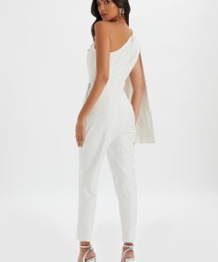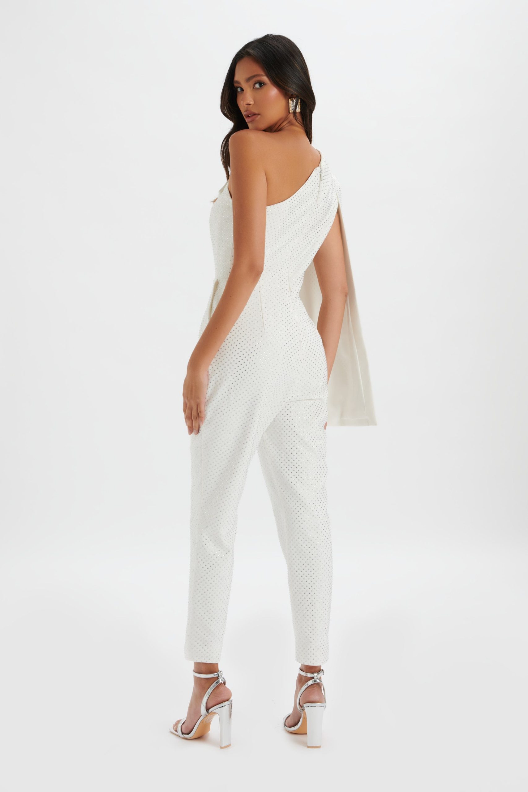 Lavish Alice Women’s Mischa Crystal Embellished One Shoulder Cape Jumpsuit In White