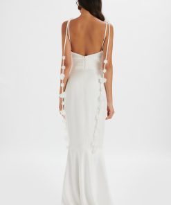 The NOVIE Floral Strap Satin Fit and Flare Maxi Dress in Ivory is an elegant choice for special occasions. Made with premium satin, it features a flattering fit and flare fishtail hemline with a centre front split. The spaghetti straps are adorned with 3D flower details, complemented by a larger flower detailing on the shoulder trim. With a low back and pleated waistline, this dress will make you feel both stylish and beautiful. Perfect for any formal event.