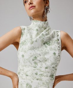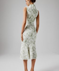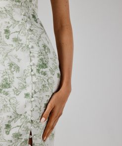 Introducing our best-selling SAFFRON High Neck Satin Midi Dress in Sage Porcelain Print. This elegant and sophisticated dress features premium crepe in a beautiful sage green porcelain print, a flattering high neck style, and a close to body fit that accentuates your silhouette. The flounced hem and pleat detail on the neckline exude elegance, while the subtle thigh split, and delicate self-fabric buttons add a touch of refinement. Spring into style with this chic midi dress, perfect for weddings, Ladies Day or any special event where you want to make a statement.