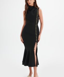 Lavish Alice Women’s Saffron High Neck Rose Button Midi Dress In Black
