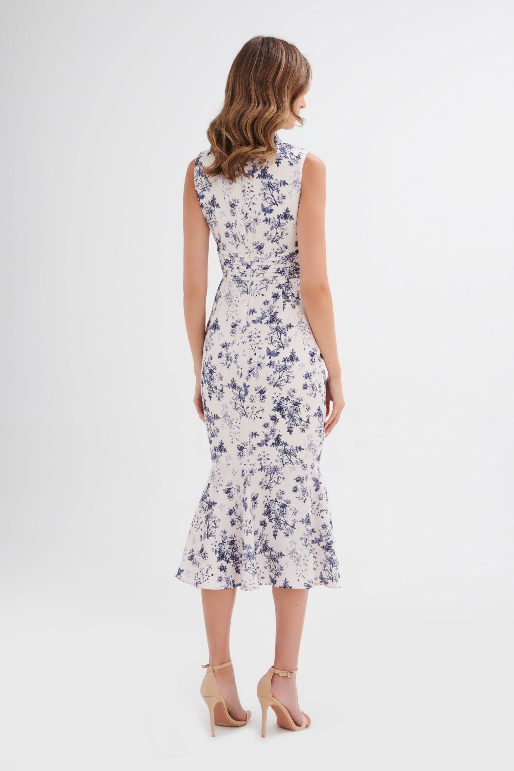 Introducing our best-selling SAFFRON High Neck Satin Midi Dress, now in a captivating navy porcelain print. Crafted from luxurious satin, this elegant dress features a chic high neck and delicate micro button detailing, adding a touch sophistication. With its flattering close-to-body fit, neckline pleats, alluring thigh split, and fit and flare design, it’s perfect for formal events and special occasions. Elevate your wardrobe effortlessly with this timeless piece.