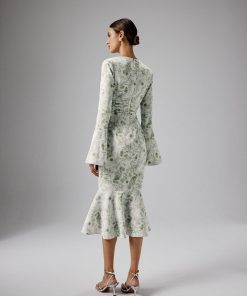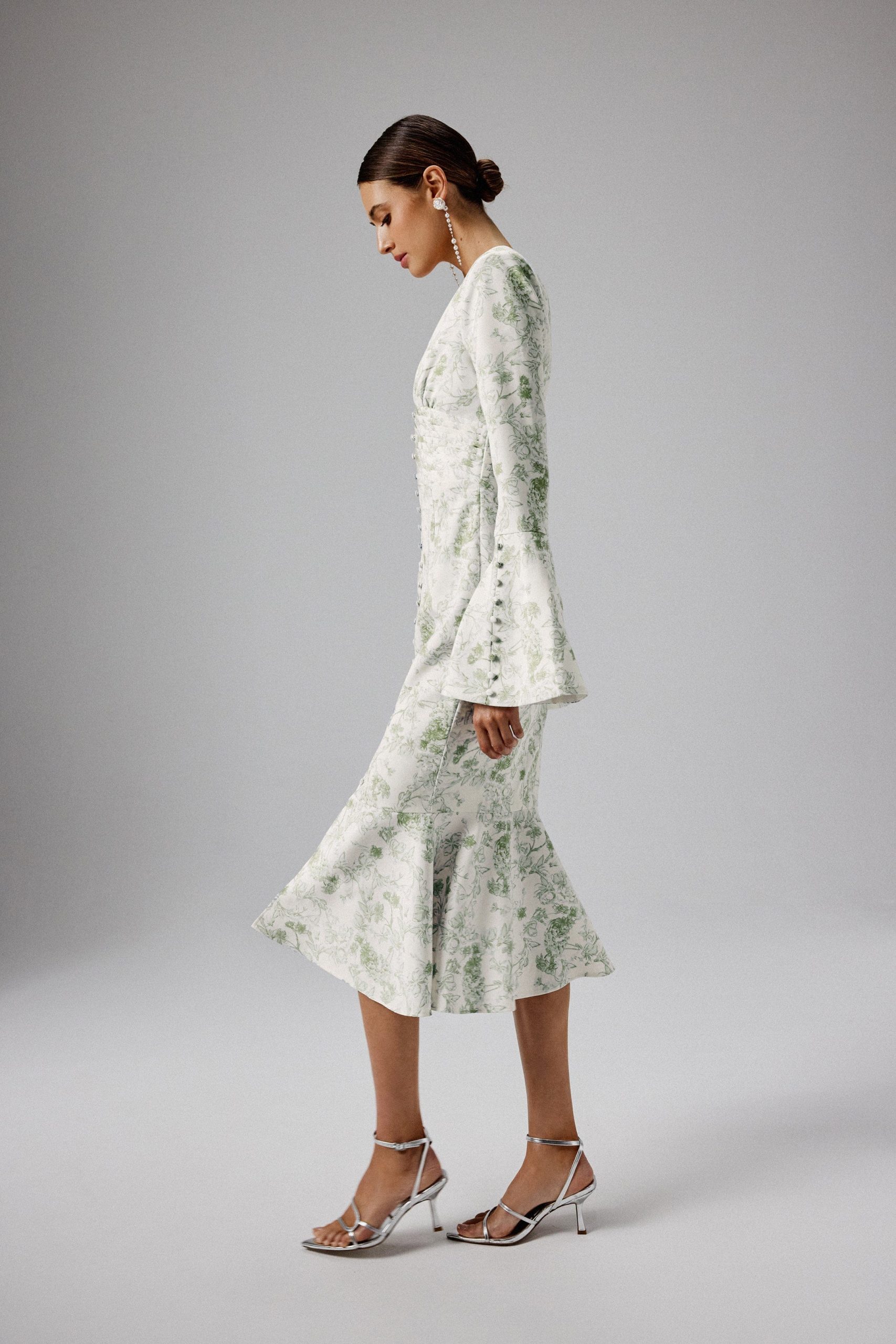 Make a statement at any formal event with our crowd-favourite SALMA Fluted Sleeve Longline Fishtail Midi Dress. Reimagined in an exquisite sage porcelain print, this best-selling design features a graceful fit-and-flare silhouette that flows into a flattering fishtail hemline. Delicate micro buttons embellish the centre front and long, fluted cuffs, lending an air of elegance and refinement, while the pleated waistband effortlessly enhances your shape. Ideal for Ladies’ Day, spring weddings, or garden parties, this masterpiece will you ensure you are the best dressed at any special occasion this coming season.