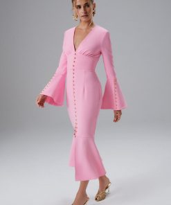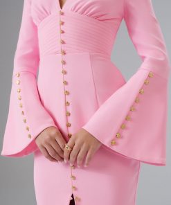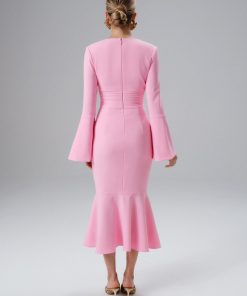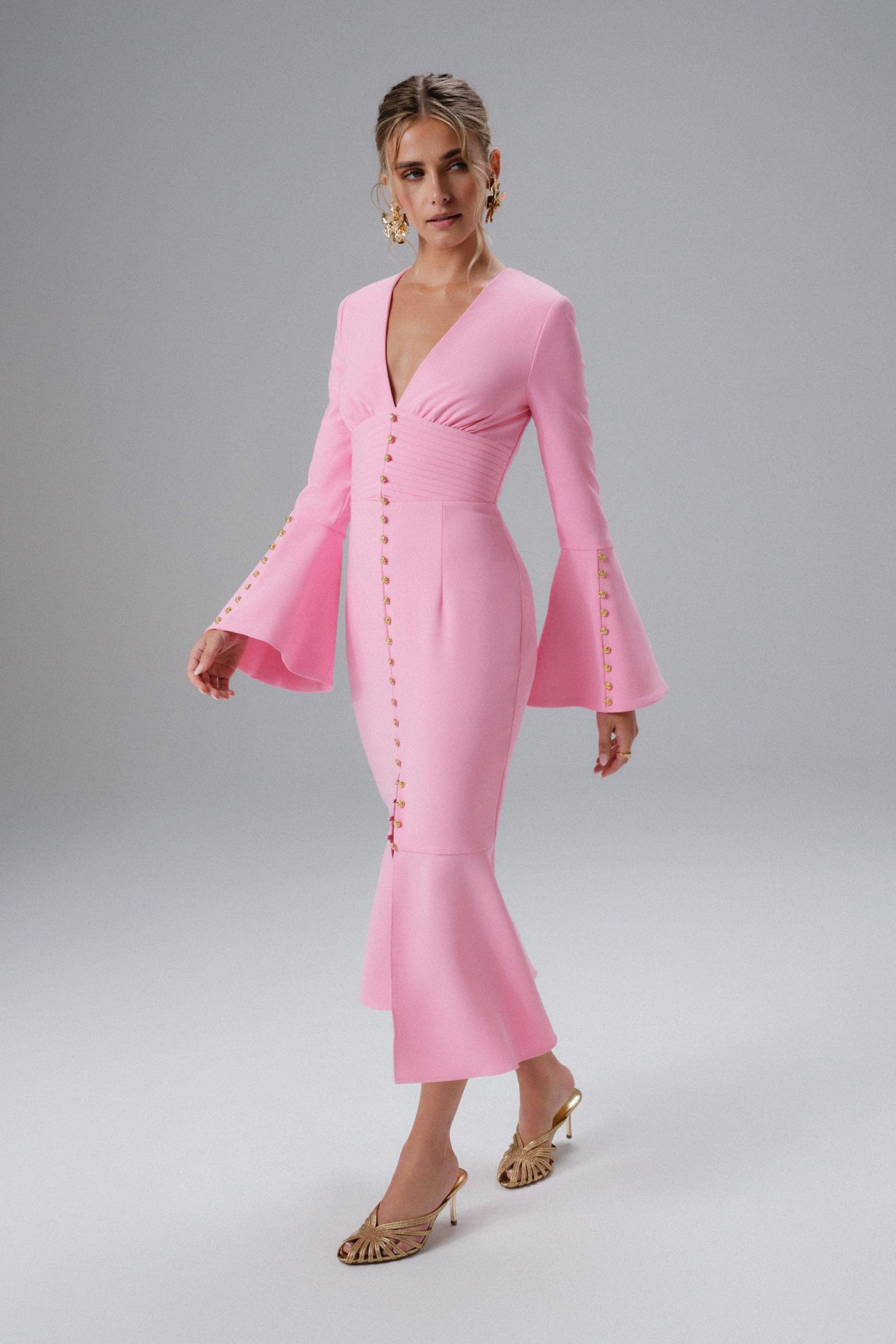 A crowd favourite, the SALMA Midi Dress , is reimagined in a vibrant pink for the perfect summer statement. Crafted from luxurious crepe, it features a close-to-body fit that sculpts your silhouette, flowing seamlessly into a flared fishtail hemline for an elegant, feminine finish. The pleated waistband cinches the waist beautifully, while gold micro rose buttons cascade down the centre front and embellish the fluted sleeves for a touch of glamour. Perfect for race season, summer events, and special occasions, SALMA is a standout piece that guarantees effortless sophistication.