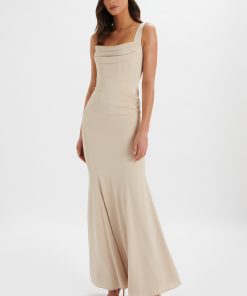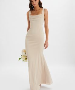 Elevate your special occasion style with our TARA Structured Satin Cowl Front Maxi Dress in Champagne. Crafted from luxurious champagne satin fabric, this dress features a flattering close to body fit and a pleated structured cowl front for a sophisticated touch. Perfect for any formal event.