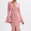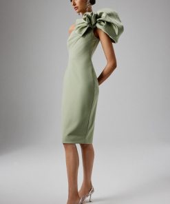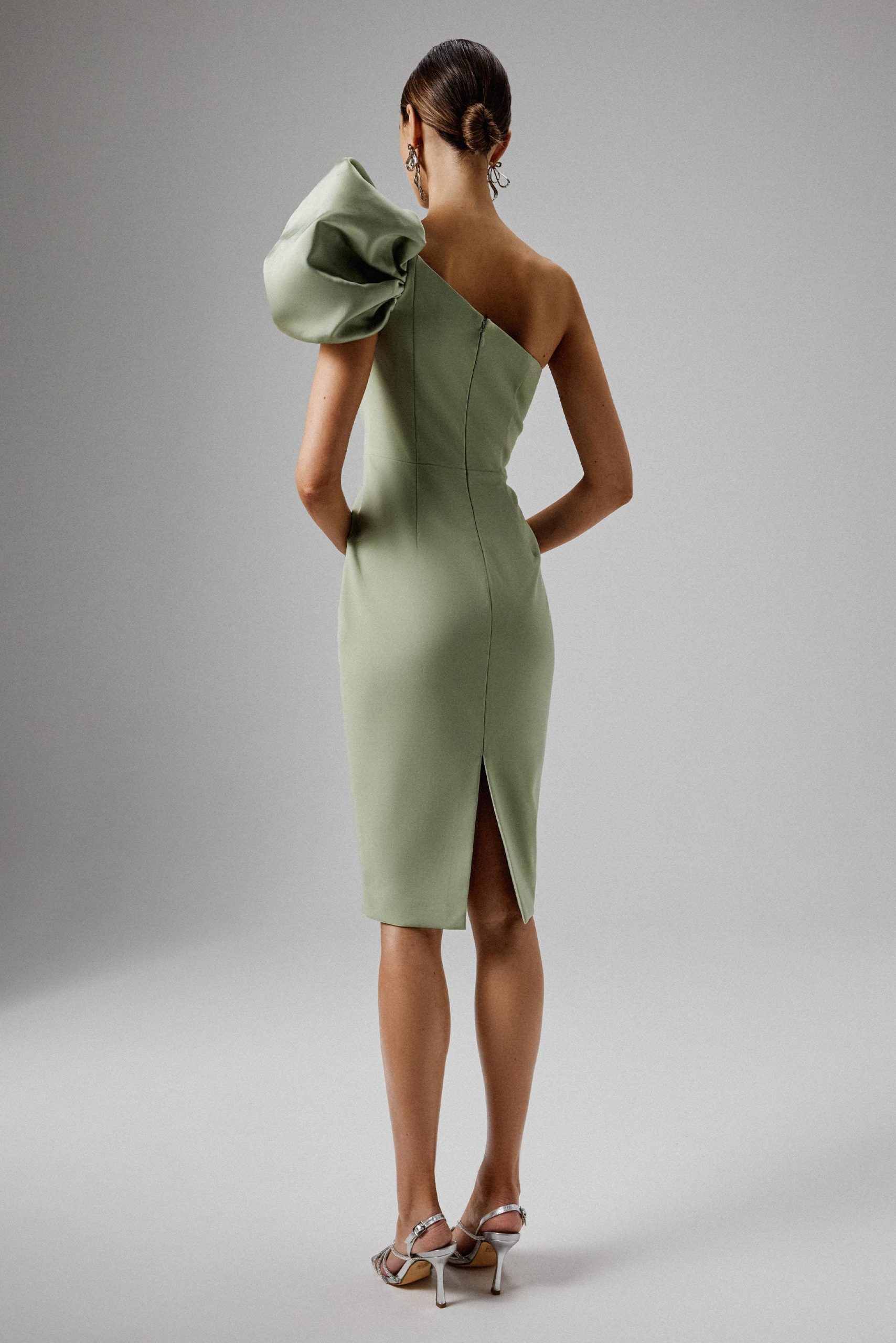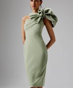 Elevate your style with our TAYTE One Shoulder Detail Midi Dress in Sage Green. This stunning dress features premium crepe fabric in a chic sage green shade, with an asymmetric neckline and voluminous satin bow detail on one shoulder. The flattering pleat detailing on the bodice and bodycon fit make it the perfect dress for races, weddings, or any formal event. A must-have for a truly sophisticated and elegant look.