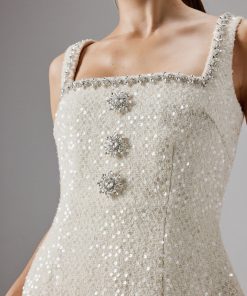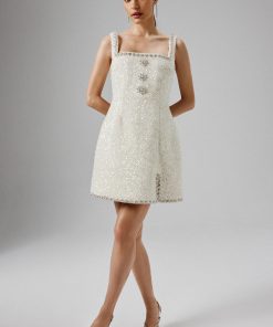 Got an upcoming cocktail night or a romantic dinner date? Look effortlessly chic in our Zoey Embellished Boucle Tulip Mini Dress in Beige—the ultimate choice for your next special occasion.This stunning mini dress features a stylish tulip skirt, enhanced with skirt fusing for added volume and flair. The square neckline, adorned with an elegant, embellished trim, exudes sophistication, while the shimmering diamante buttons at the centre front elevate the dress with a touch of luxury. With its captivating design, this dress radiates romantic charm, making it a must-have for your wardrobe.